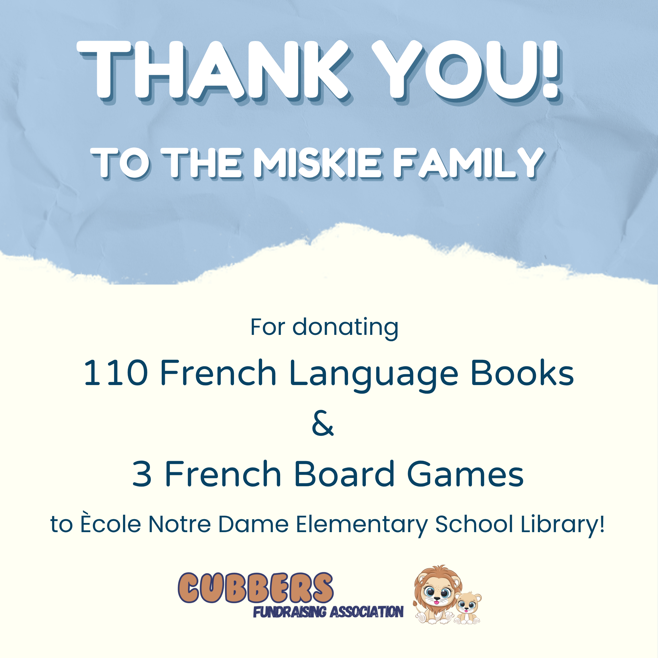 The Miskie family donated 110 French Language Books & 3 French Language Board Games to the École Notre Dame Elementary School Library!Description goes here -