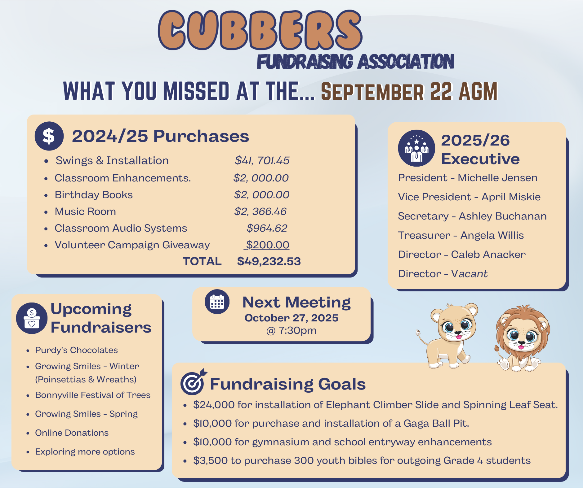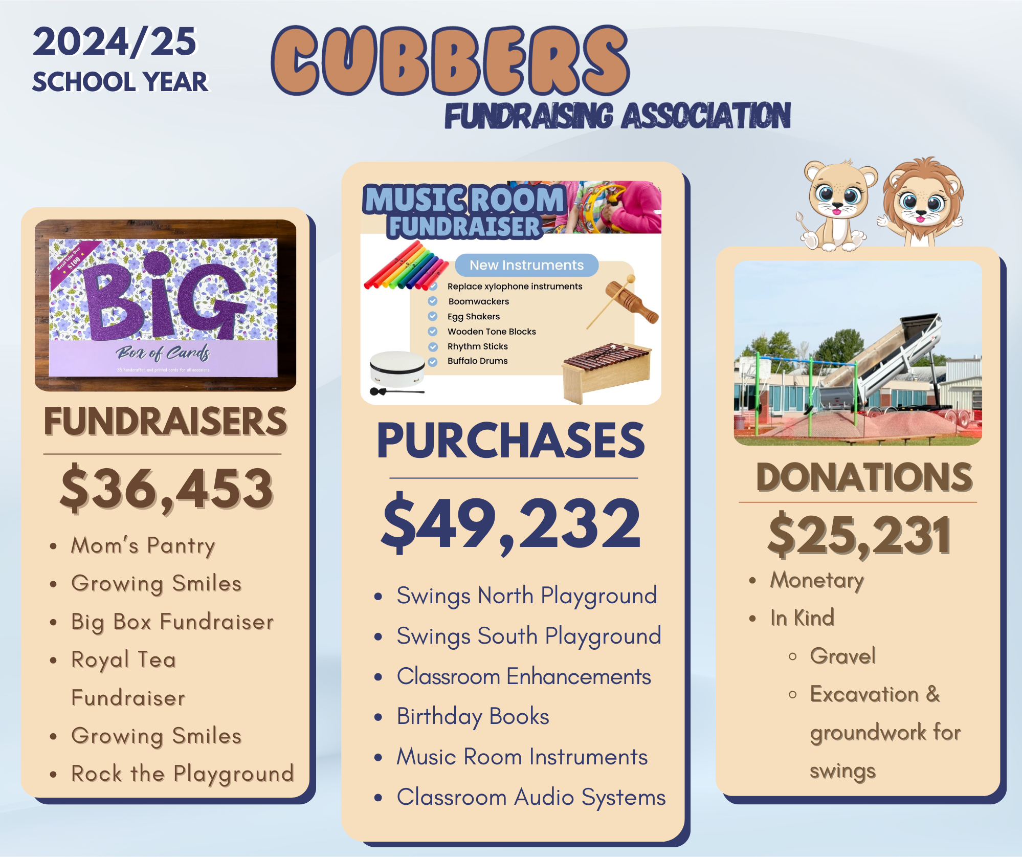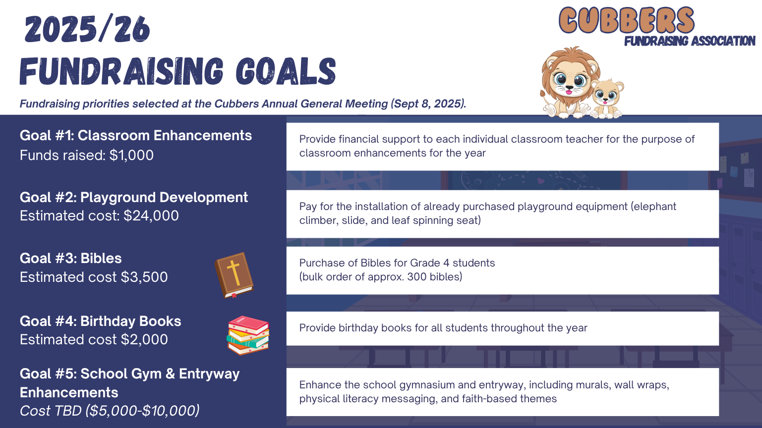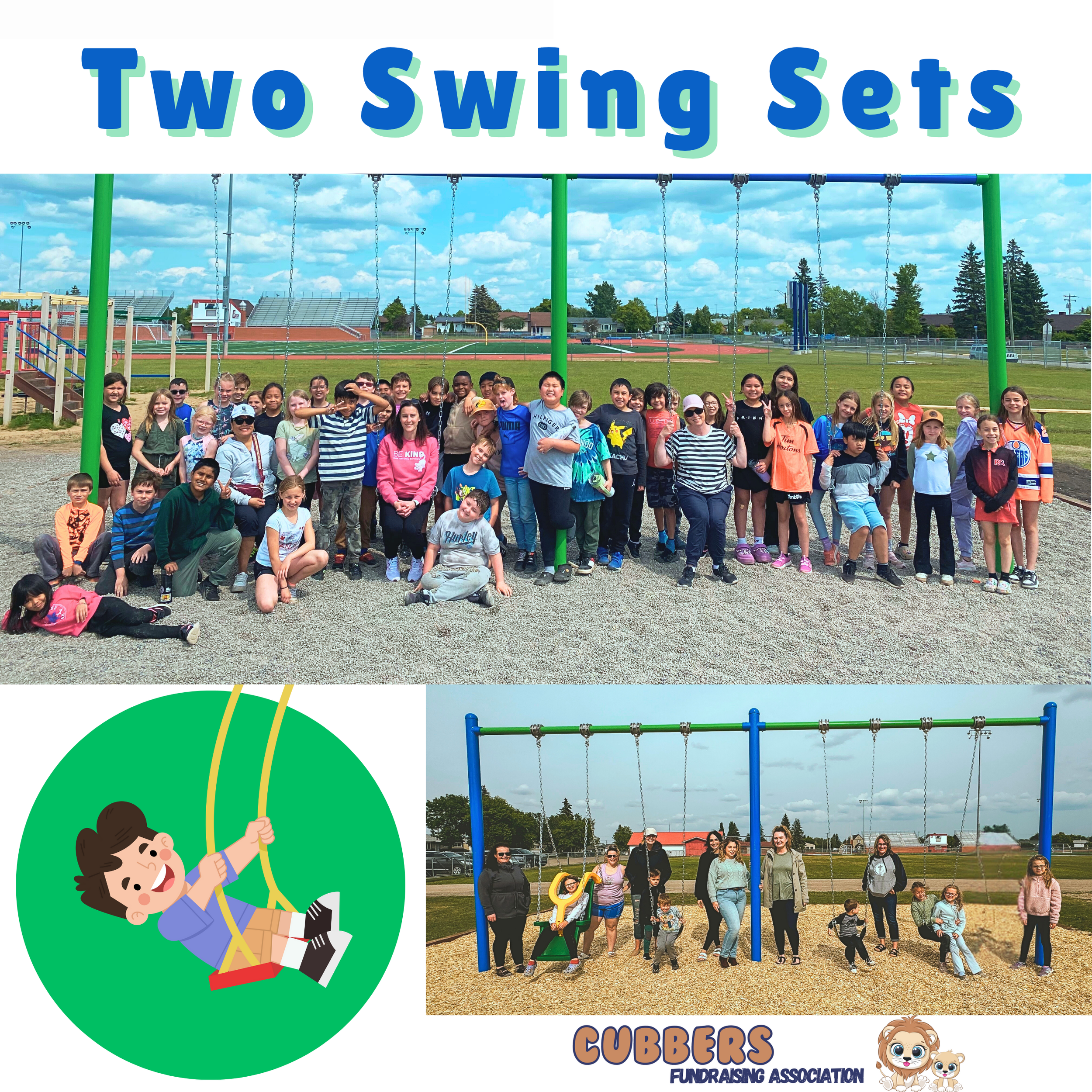 Cubbers purchased two sets of swings for the school playgrounds using fundraising profits along with generous contributions from local supporters, including Superior Propane, Rockslide Gravel Ltd., RayDayce Construction, Grynn Contracting Ltd., B-Line Directional Drilling, and many dedicated student families who made donations. A special thanks to Elevated Surface Works for donating their time and equipment for the ground work and installation. -